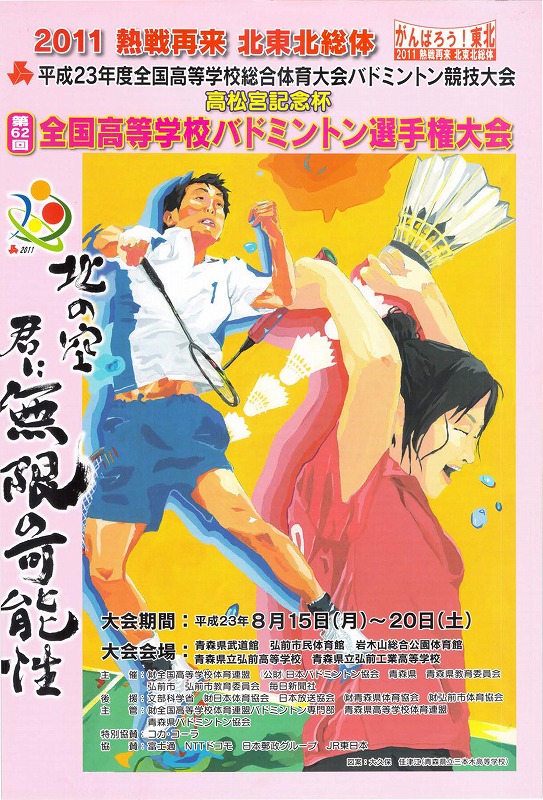 | 主催 | (公財)全国高等学校体育連盟 (公財)日本バドミントン協会 青森県 青森県教育委員会 弘前市 弘前市教育委員会 毎日新聞 |