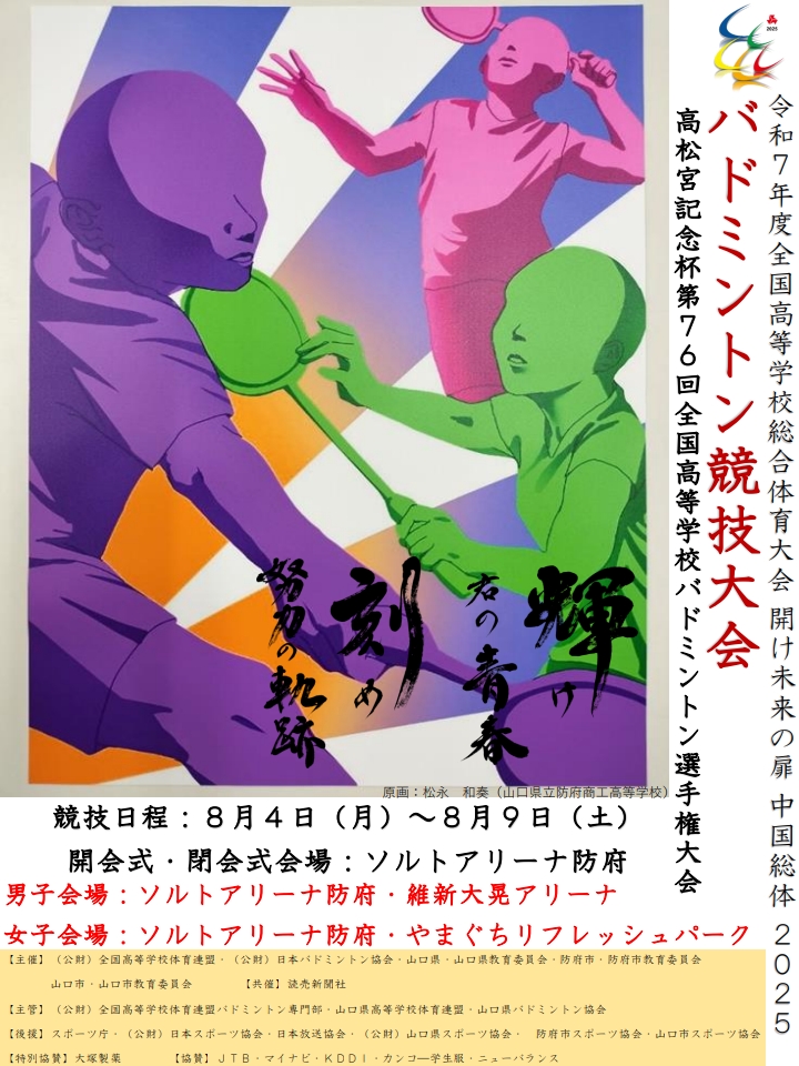 | 主催 | (公財)全国高等学校体育連盟 (公財)日本バドミントン協会 山口県 山口県教育委員会 防府市 防府市教育委員会 山口市 山口市教育委員会 |